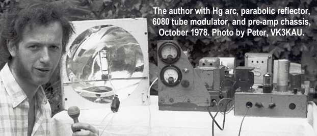 After my article's publication in January 1979, one boffin wrote to "Amateur Radio" virtually claiming that our system couldn't provide results comparable to the solid state systems of that time. He had used LED's and relatively small 35mm camera lenses, obtaining a range no greater than fifty feet. As I had not then received the optical transmitting permit from Telecom, I was unwilling to fully reveal the potentialities of the arc in terms of sig/noise and range, now revealed on another page on this website. The solid state system could then only beat the arc in bandwidth. I contacted the engineer concerned and challenged him to measure the sig/noise of our arc system in operation. The challenge was not accepted, neither did that engineer substantiate his own claims.