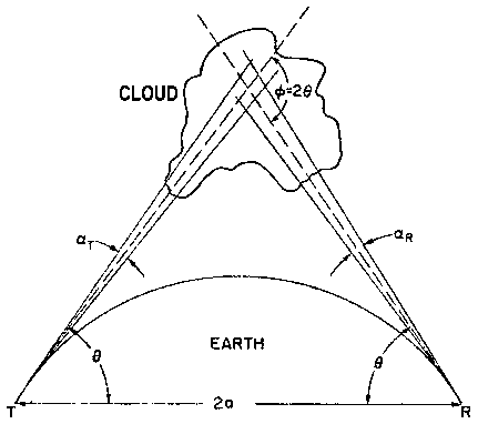 Assuming that the beam widths are very much smaller than the angle between the transmitter and receiver beams and the line joining the two sites; and considering the simple case where the transmitted and received beams are tangential to the earth's surface with a cloud at the beam intersection, the minimum height of the cloud for small θ (in radians) will be: