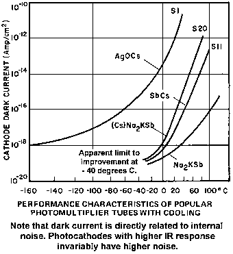 Like most photosensitive devices, some photomultiplier cooling is advantageous, though not obligatory. Variation of photomultiplier dark current with temperature for various photocathode substances is shown in the graph below. Significant reductions in internal noise may be made by cooling to the temperature of dry ice. Below -400C little improvement can be attained with most photocathode materials.