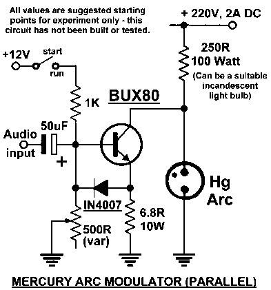 Rodney VK3AAR suggested the use of a modulator consisting of a high-voltage power transistor (eg. the BUX80) wired in parallel with the arc to circumvent these problems, with a hefty resistor dropping from the 200 volt rail to both, as shown in the diagram below: