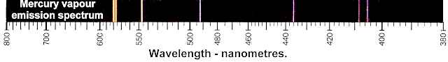 The various wavelengths emitted by a typical high pressure mercury arc are shown in the spectrum above. Either of the dominant spectral lines at 435.8 or 546.1 nm could be selectively filtered to reduce background ambient pickup. A typical high-pressure mercury arc's relative power outputs of these wavelengths are tabulated below: