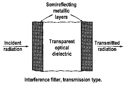 The standard type of narrow-band optical filter consists of a transparent film of known thickness with semi-reflecting metallic films on both sides of the pellicle (see diagram below). Maximum transmission occurs by a process of optical interference at the wavelength for which the dielectric's optical thickness is an integer multiple of half-wavelengths. Single or multilayer filters of this type are obtainable, covering any wavelength required between 200 nm (UV) and 20000 nm in the far-infrared. These are sometimes offered by scientific supply houses as 'laser line filters'.