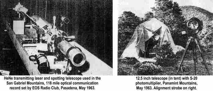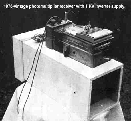 [Author's note, 1 May 2005]: During the 1976 tests, various modulated sources and detectors were tried. LED's were tried and quickly rejected. Their output at that time was utterly insignificant by comparison with the arc. The available output flux from LEDs has increased by about five orders of magnitude since.