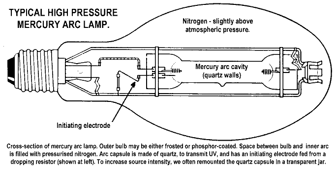 In commercially available high pressure mercury lamps, the discharge is maintained within a small quartz phial. This is usually surrounded by a much larger diffusing bulb, sometimes coated with a fluorescent substance to make use of the residual ultraviolet output. For optical communication usage, the quartz phial can be removed from the diffuser by smashing the outer diffusing bulb, and re-mounting it inside a small clear-walled glass vessel or jar. This should be done with great care, and on no account should the arc be operated without its protective glass enclosure. The quartz phial should not be handled without gloves, and if it should happen to receive a fingerprint, the quartz should be carefully washed in denatured alcohol before usage. A physical hazard exists from the high pressures at which the arc operates, and it emits harmful ultra-violet radiation which penetrates the quartz bulb, most of which is blocked by glass.