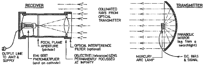 While the silicon photodiode and the cadmium sulphide photoconductive cell both have higher quantum efficiency (the number of photoelectrons emitted from the photocathode per incident photon) than the photomultiplier in the visible spectrum, their internal noise and dark current at room temperatures is not easily overcome. These limitations of the available detection devices, together with the difficulties encountered in detector refrigeration (eg. window frosting, condensation, and potential cracking of the glass envelope) all augur towards the use of optical communication systems in the 400 to 500 nm region, at least for the amateur. [Author's note, May 2005: this statement was based on the feeble LED performance available in the 1970s. I would now use the new Luxeon III's (super high output visual LEDs) operating around 630 nm at the red end of the spectrum, capable of 4 watts output. P-I-N photodiodes are quite sensitive for receiving red light, but they lack the speed combined with the large sensitive area that photomultipliers had]. Suitable modulated light sources in the short-wavelength region of the spectrum include the mercury arc lamp, the HeCd laser and the argon laser (488 nm).