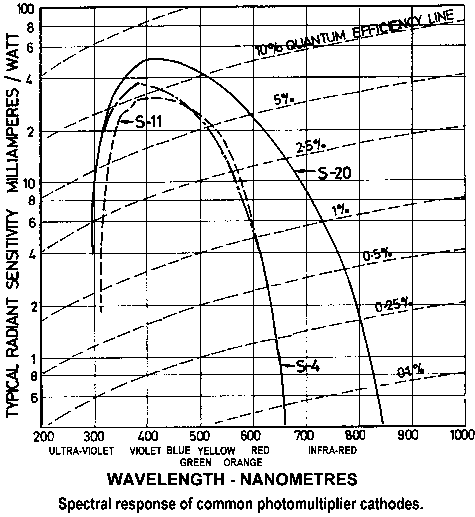 Typical multiplier photocathode surfaces suitable for use in the 400 to 500 nm region may have peak quantum efficiencies of around 16%, as this graph of popular photomultiplier spectral response curves reveals.