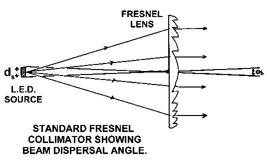The case of a collimated non-coherent light source, such as a gas discharge lamp or surface-emitting LED collimated by an imperfect glass lens or fresnel is more complex. The source is no longer diffraction limited, but occupies the physical dimensions of the source surface. Beam dispersal is governed by the angle θ formed by lines connecting the edges of the source with the centre of the collimating lens: