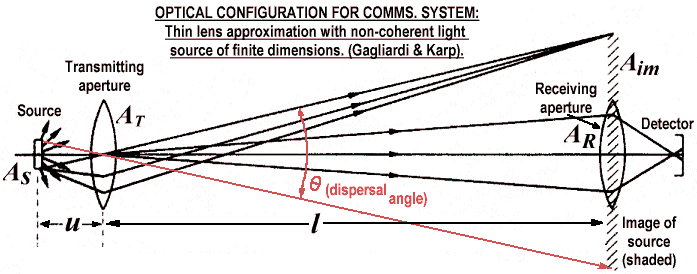 As shown above, the transmitting case enables us to geometrically determine the beam divergence, the beam intensity and the proportion of the transmitted beam intercepted by the receiving aperture (area AR ). These parameters are governed by the aperture size of the source (area AS ), the radiance of the source (L), the aperture of the transmitting lens (area AT ), transmitting lens focal length (u), the distance to the receiver (l), the size of the virtual image of the light source at the receiver (area Aim) and the aperture of the receiving lens (AR ). Without going through the steps of deriving the formula, demonstrated by Gagliardi and Karp in their book on 'Optical Communication Systems', the received optical power (ΦR) is given by the following: