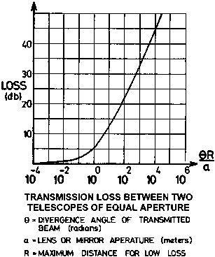 The accompanying graph shows the loss of laser light between two collimating optical systems (transmitter and receiver) of equal diameter and aperture "a". The loss is seen to be kept low out to a distance "R" between the systems, of the order of a / θ, where θ is the divergence angle of the transmitted beam. For θ = 10-4 radian (a dispersal so small as to render aiming difficult) and a = l metre, R approx = 10 km. Since the beam focussing achievable depends on wavelength, atmospheric turbulence and the aperture area of the system's optics; as θapprox = wavelength / a , another way of expressing the distance for low loss with diffraction-limited optics of high quality is: