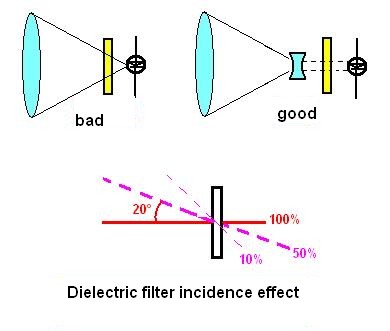 The main problem arising from the design of these filters is that they only provide their specified pass-band with incident radiation perpendicular to the filter surface. For radiation arriving at an angle to the filter, the pass-band shifts to shorter wavelengths, and broadens. At extreme angles the passband can become asymmetrical and misshapen, or it can split into two or more discrete bands. This is a particular problem with lenses of large aperture and short focal length, where rays can enter the filter over a broad cone angle. For this reason, they suit receivers using glass telescope objectives of with a numerical f/D ratio of f8 or higher, and are not really suited to very short focal length fresnel objectives.
