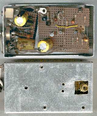 A PHOTO OF THE 7MJ OPTICAL RECEIVER UNDER CONSTRUCTION is seen below, the circuit board side above and the objective lens side below, with an extra LM386 speaker amplifier on a sub-board on the left. Please note that the matrix board has been cut away in the vicinity of the input FET's gate to reduce the chance of moisture leakage at that high resistance feed point. The "feedback capacitor" is the twisted yellow insulated wire in the centre of the main board. The photodiode in this case is the IPL10043:
