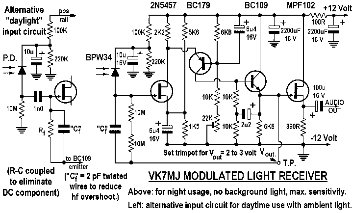 For daytime operation of the receiver circuit, the DC coupling from the photodiode becomes a liability as scattered ambient daylight received by the photodiode will probably shift the amplifier's DC conditions to cutoff. In this case, the modified input circuit shown on the lower left of the main circuit diagram is desirable. Capacitive coupling from the photodiode to the input FET's gate becomes desirable, though this increases stray capacities and noise from the extra input resistor and capacitor required.
