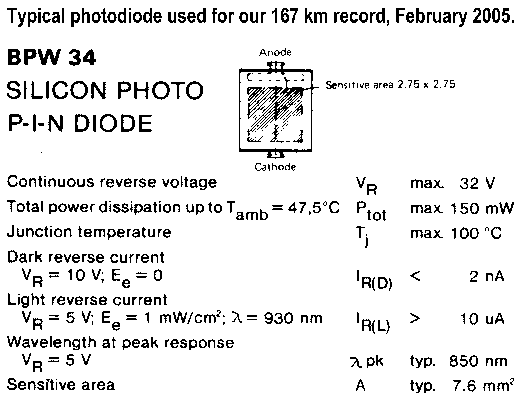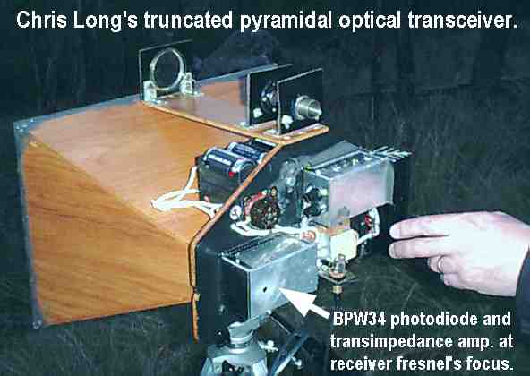 Our amplifier/receiver is a compromise approach, probably not quite as sensitive as the K3PGP circuit, but it does seem to be very linear in transfer characteristic, with flat response to around 30 kHz when it's used with most smaller photodiodes. This high frequency limit could easily be extended to several hundred kilohertz, at the expense of some sensitivity, by reducing the pre-amp's feedback resistor. This receiver's noise figure may not be absolutely optimal, but we've used it for atmospheric optical comms over the last 15 years in Australia, setting a local 43 km record with it in 1991 (Sunbury to East Hawthorn, Victoria), and achieving 167 km with it (Mt Barrow - Mt Wellington, Tasmania) on 19 February 2005: