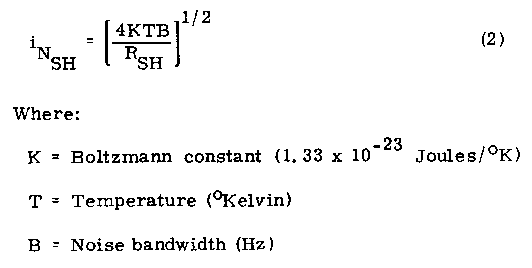 The shunt resistance generates a thermal noise current that exhibits a flat noise vs frequency spectrum from DC to approximately the photodiode cut-off frequency. The RMS value of the noise current is inversely proportional to the square root of the shunt resistance as shown in the following Johnson noise formula: