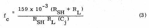 The frequency response of the PV photodiode in the terminated configuration of figure 7 is a combination of intrinsic photodiode response and the RC response time produced by the parallel combination of junction plus stray capacity and shunt plus load resistance. The intrinsic photodiode response is active area dependent and is approximately equal to 0.1 MHz-square cm. The cutoff frequency as controlled by the RC time constant is determined by Equation 3: