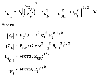 Because gain peaking is determined by the individual characteristics of feedback impedance, amplifier gain/phase angle, and photodiode source impedance it becomes an involved problem to define an accurate total noise equation. A reasonable solution is to neglect gain peaking which can be compensated and to define the total noise by its contributing sources. Equation 6 is derived from figure 11, where the various noise generators are identified, and provides a good approximation of the total noise voltage present at the output of an operational amplifier/photodiode combination: