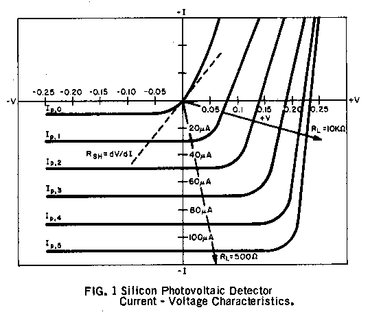 When a silicon p-n junction is operated with no externally applied voltage, it is considered to be operating in the PHOTOVOLTAIC mode. Under this zero applied voltage condition and low levels of incident light, the p-n junction will generate a current proportional to the light power incident on the active surface. This photon induced current, or photocurrent, will divide between the diode internal junction resistance and the parallel load resistance. The direction of photocurrent flow in the external circuit will produce a voltage across the load resistor that will act as a forward bias on the p-n junction. It is this external voltage source, created by the combination of light power, junction resistance, and load resistor that defines and limits the performance of a PHOTOVOLTAIC p-n junction as a linear light detector.