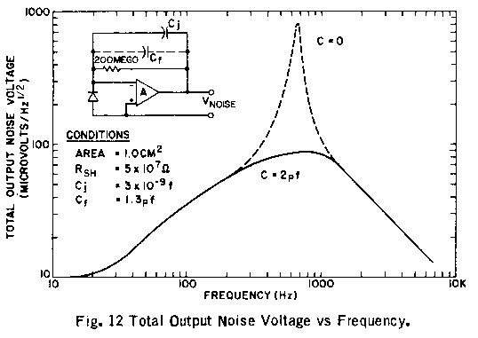 The various noise generators which contribute to the total output noise voltage of an op-amp/photodiode are shown in figure 11. For large area photovoltaic detectors, the output noise voltage at frequencies greater than 50 Hz is determined by the amplifier noise voltage generator, the photodiode impedance, and the feedback impedance. In most cases, "gain peaking" of the noise voltage will occur but this can be controlled as previously discussed. Below 50 Hz the total noise voltage is affected by a combination of photodiode noise current, amplifier input noise cur- rent, and the value of feedback resistance. Below 10 Hz, the magnitude of the l/f characteristic of the amplifier noise current will tend to control the magnitude of the output noise. Figure 12 is a plot of the output noise voltage for a large area PHOTOVOLTAIC detector coupled to a typical operational amplifier. It is interesting to note in figure 12 how the noise performance is improved by the addition of a 2-picofarad feedback capacitance: