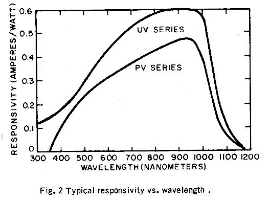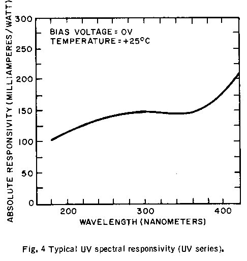 NOTE: The UV-100B, when selected for a breakdown voltage greater than l00 volts, and when operated photoconductively at 90 volts reverse bias, will have a frequency response in excess of 150 MHz to pulsed UV and visible sources.