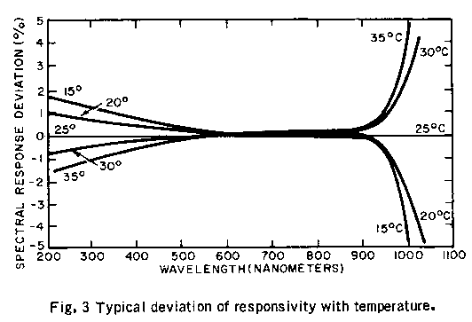 The EG&G series of PHOTOVOLTAIC light detectors has been optimised for wide spectral response and maximum responsivity. Figure 2 displays a typical PV spectral response having a peak responsivity of 0.47 Amperes/Watt at 0.95 micrometers. The deviation of spectral responsivity as a function of temperature is shown in Figure 3. From 0.40 to 0.95 micrometers, the deviation is less than 0.05% per degree Centigrade.