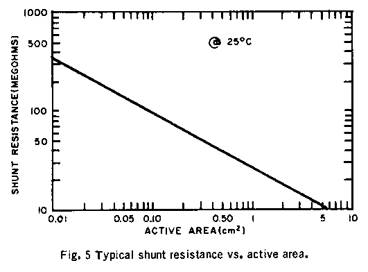 The shunt resistance, or dynamic junction resistance at zero voltage, is not only active area dependent, it is also temperature dependent. Figure 5 displays the expected variation of shunt resistance as a function of active area and Figure 6 shows the ratio of shunt resistance at some expected operating temperature to the actual shunt resistance at 25o Centigrade.