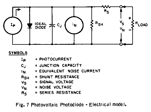The electrical equivalent circuit for a PV photodiode is shown in Figure 7. The flow of photocurrent is in a direction so as to develop a load voltage which will forward bias the ideal diode. It is the development of this forward voltage across the ideal diode that limits the PV photodiode response linearity. The equivalent noise current generator is associated with the junction shunt resistance and follows a flat Johnson noise spectrum.