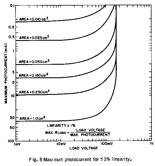 The active area dependency of series and shunt resistance creates a singular linearity solution for each photodiode. Figure 8 is a graphical presentation of a 1% linearity equation for the various photodiode active areas normally encountered in instrument applications. A later section of this application note will discuss the extension of the PV response linearity range by the use of an operational amplifier.