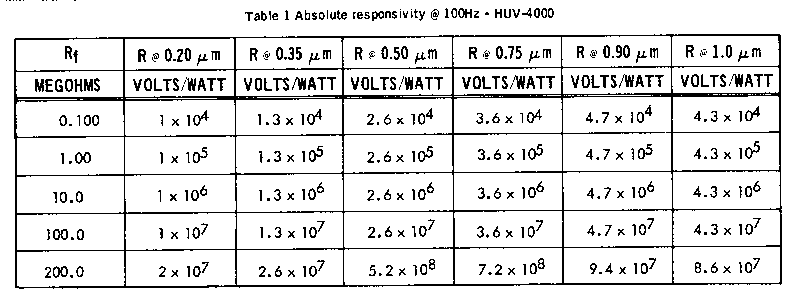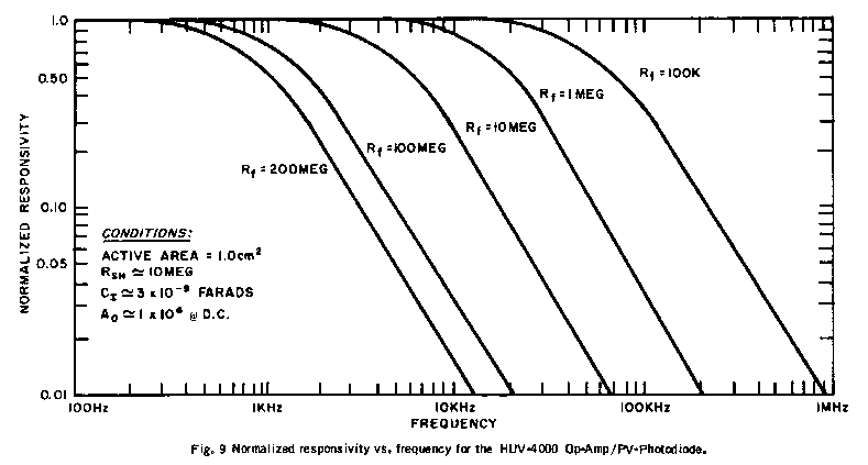 The total responsivity of the operational amplifier/photodiode combination is the product of the wavelength dependent photodiode responsivity in Amperes/watt and the frequency dependent transimpedance of the closed-loop amplifier. Figure 9 is a graphical presentation of the normalized responsivity for a typical operational amplifier/photodiode with various feedback resistors; table 1 lists the absolute responsivities at specific wavelengths for each value of feedback resistor.