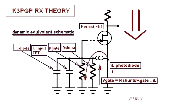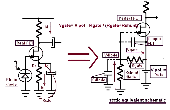 Yves, F1AVY, near Lyon in France, has been kind enough to analyse the circuit above. He tells us that at very low light levels, the leakage from the gate of the FET is typically 500 gigaohms, and the leakage resistance of some of the best small P-I-N photodiodes (eg the S2386-18K) is near 100 gigahoms. In absolute darkness, with the best and smallest photodiodes, and particularly at low temperatures of operation, this would provide a reverse bias on the photodiode of perhaps 0.7 volt. The diagrams below, drawn for us by Yves F1AVY, explains this circuit's operation: