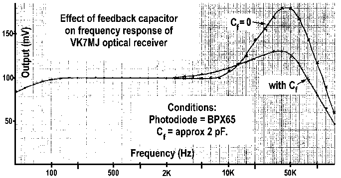 This, of course, depends on the self-capacity of the P-I-N photodiode used. The limit to raising the feedback resistor is set by the high-frequency response of the system degrading beyond the point where speech modulation (3 KHz) can be adequately accommodated. The value of Rf must be optimised for each photodiode.