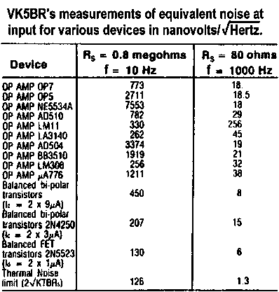 Discrete componentry was used, as in the late 1980s we felt more confident of achieving a low noise figure this way than with IC's. This was mostly the result of our reading 'Amplifier Noise' by Lloyd Butler VK5BR in Australian 'Amateur Radio' magazine, November 1985 pps 18 to 21. Lloyd systematically tested a series of 'better' ICs and found that careful design with discrete circuitry could then provide substantially better noise figures than ICs. The table below (ibid, p.19) summarises his findings: