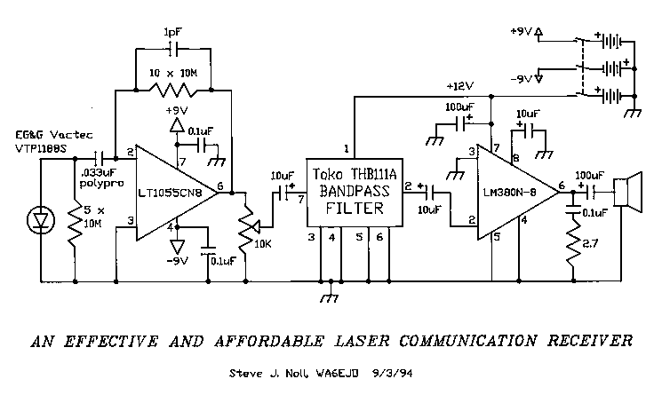 If response is required beyond about 20 KHz bandwidth, or with photodiodes larger than 2 mm2, operation into a FET-input transimpedance (negative feedback) current pre-amp of the type used by Steve Noll WA6EJO and ourselves is recommended. This would be rather more linear and immune to stray light than K3PGP's PV system, if not quite so sensitive. Steve (refer the WA6EJO website) suggests the AD743JN as an alternative to the LT1055CN8 pre-amp IC, after actual trials of his laser receiver unit. The bandpass filter (Toko THB111A) is an optional refinement, while many audio output ICs such as the LM386 would provide equal results to the LM380 (typical circuit below):