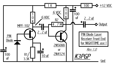 This confirms that with minimal background light, the unloaded "photovoltaic" system of photodiode operation (similar to the 'night operation' receiving circuit of K3PGP) provides the least noise figure for baseband audio modulation up to around 10 KHz. Some adjustment of R1 and R2 may be needed to optimise the circuit voltages. Refer the K3PGP receiver circuit below, or his web site:
